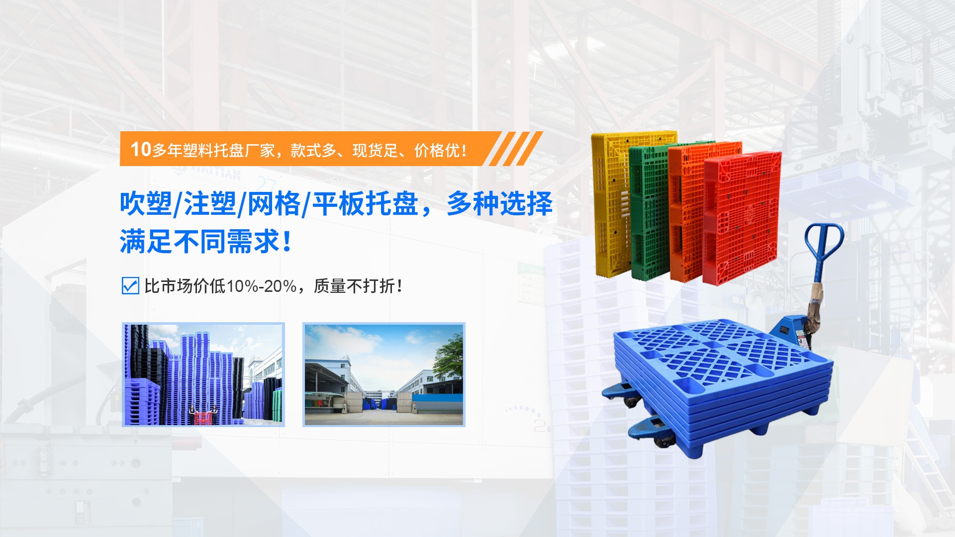 東莞市惠通塑膠制品有限公司老廠成立于2006年,是一家專業從事塑料托盤、塑料周轉箱、物流包裝容器 等塑膠制品研發、生產與銷售的高新技術企業。憑借十多年的行業深耕 ,我們已與多家知名上市公司建立長期穩定的合作關系,產品廣泛應用于物流倉儲、食品加工、電子制造、醫藥化工 等行業。